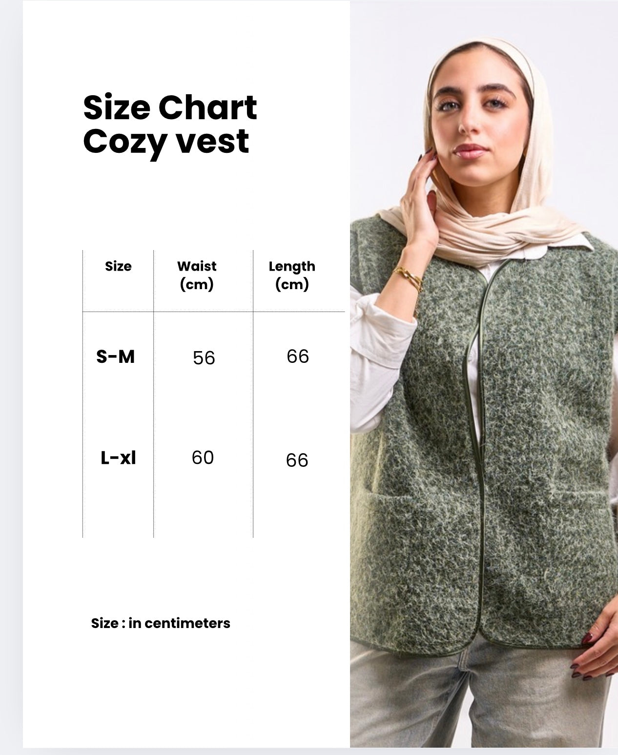 A cozy wool vest in soft olive , crafted from textured wool fabric that feels like soft curls. Perfect for layering over shirts or sweaters, adding a warm and trendy touch to your everyday style.