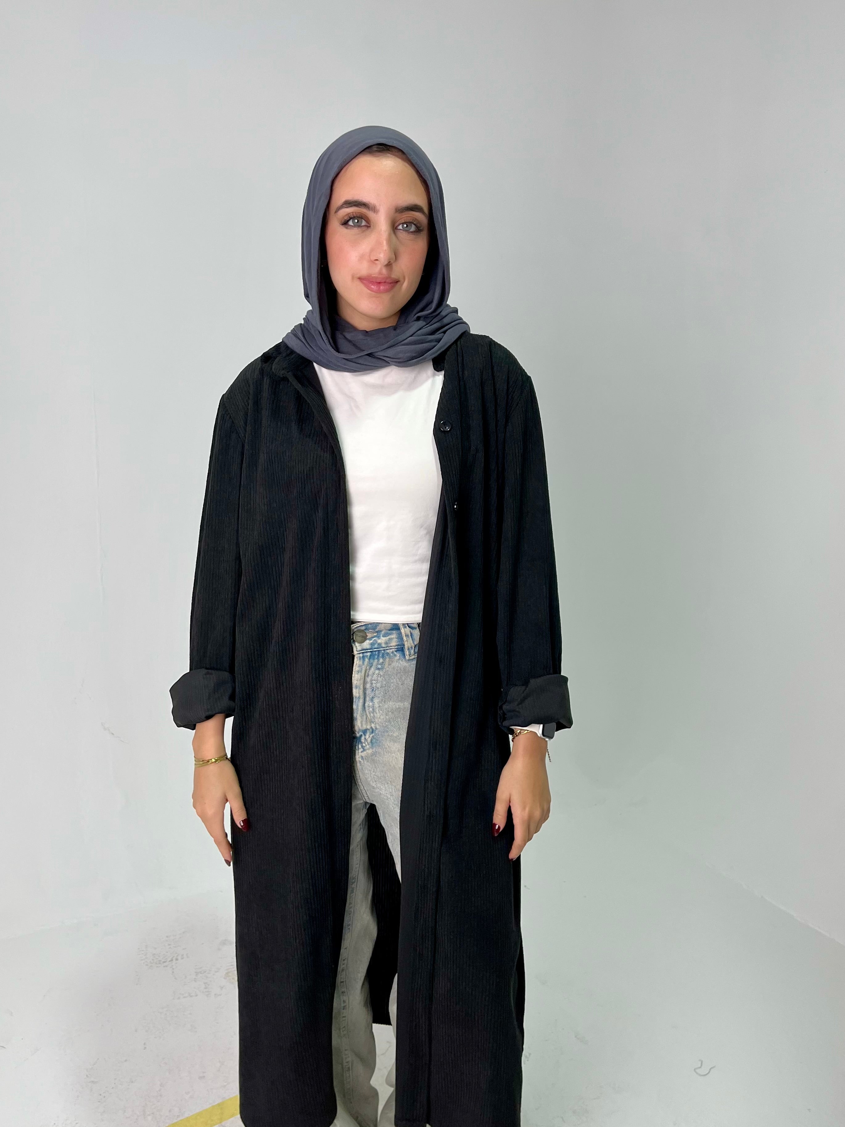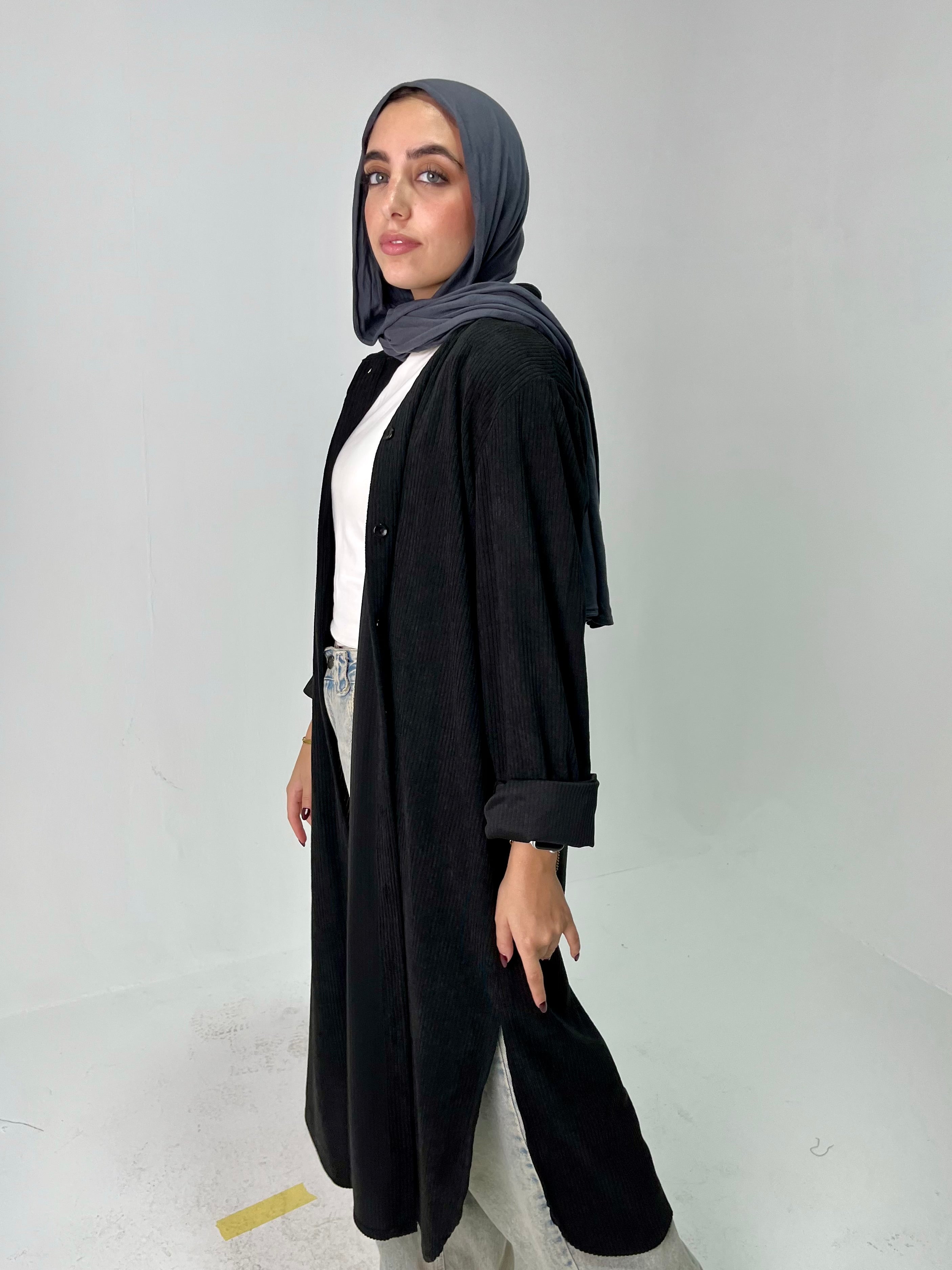 A chic long ribbed shirt in Grey, designed for effortless layering. Made from soft corduroy fabric that adds warmth and texture, it’s the perfect statement piece for fall and winter outfits.