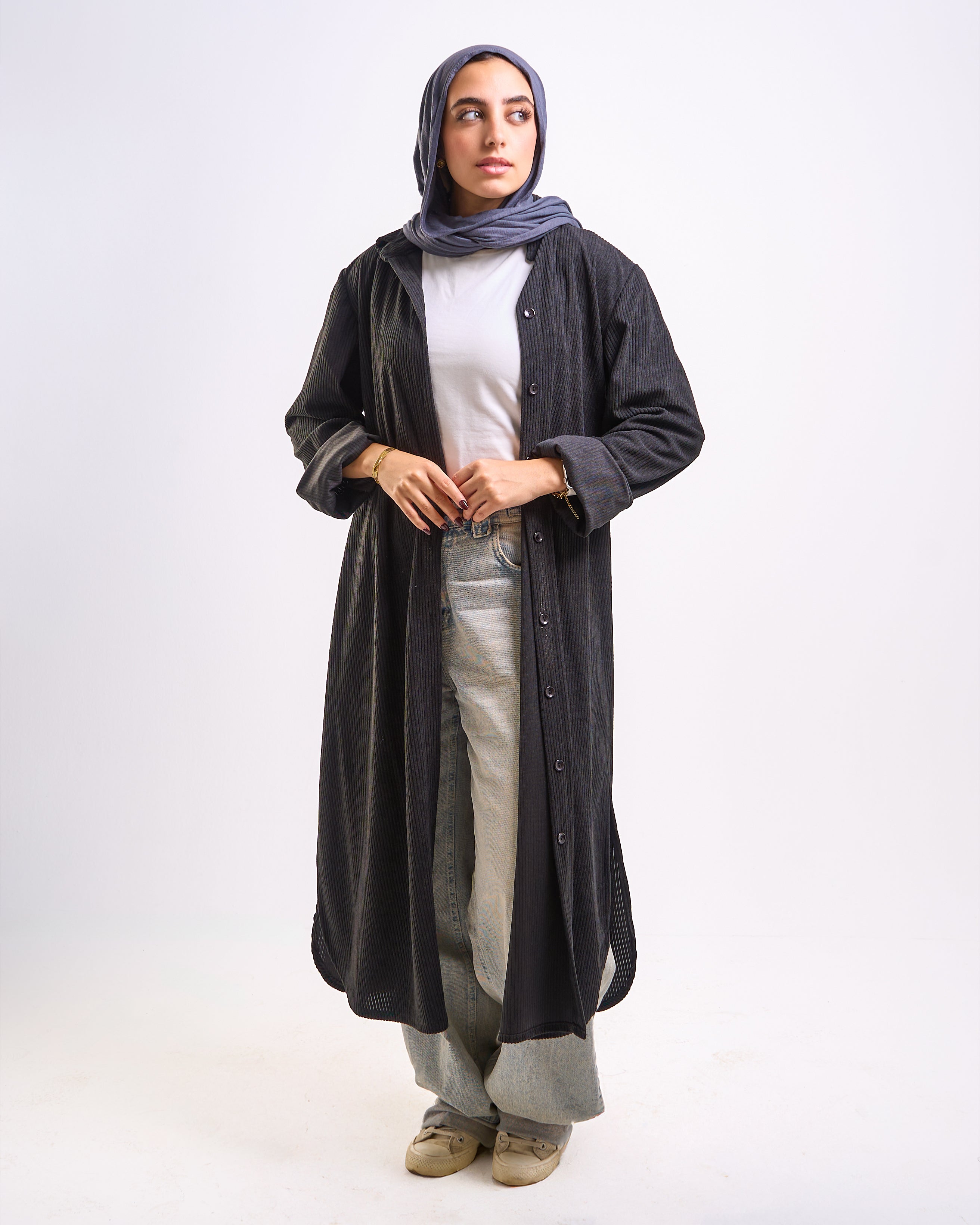 A chic long ribbed shirt in Grey, designed for effortless layering. Made from soft corduroy fabric that adds warmth and texture, it’s the perfect statement piece for fall and winter outfits.