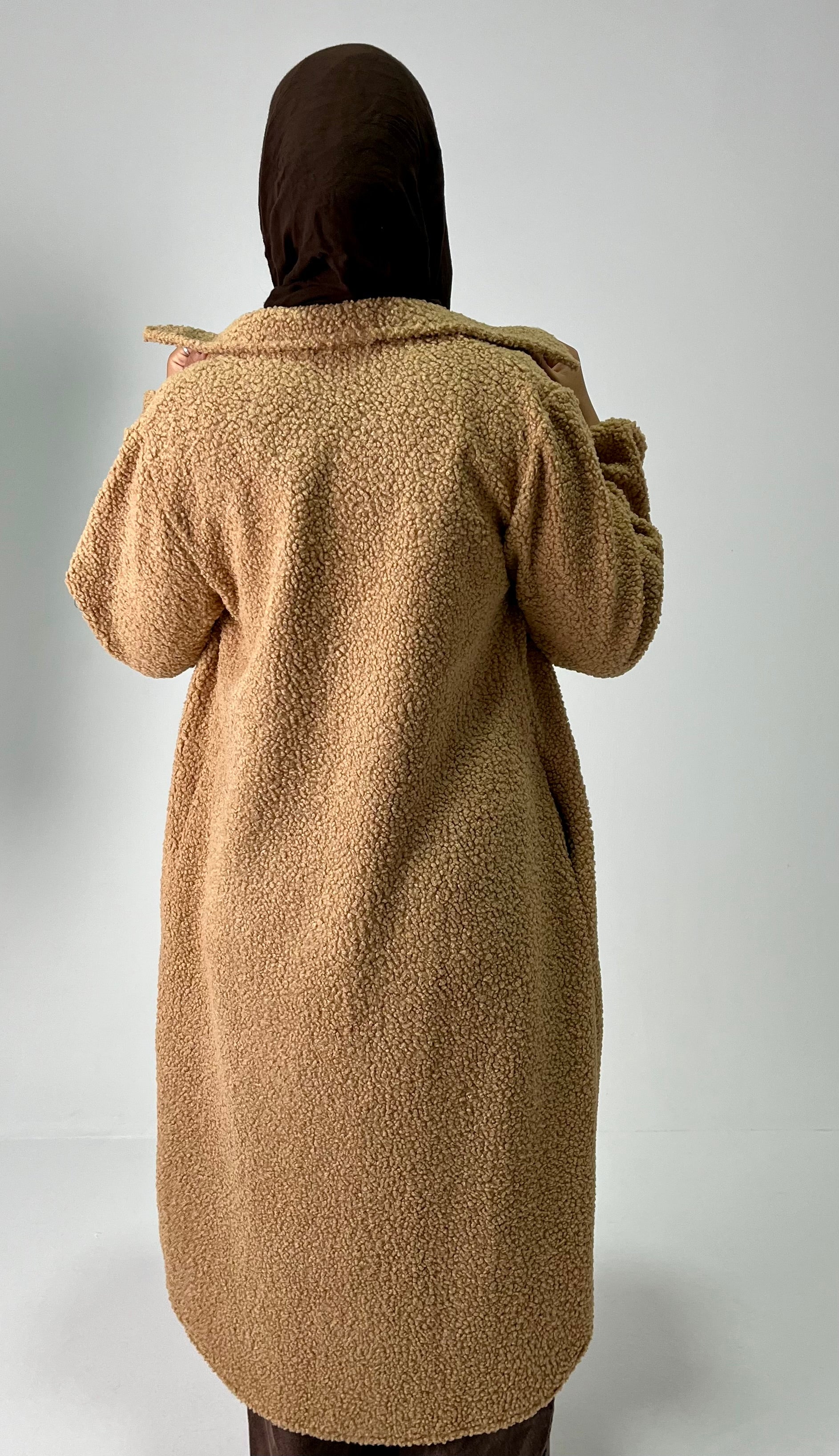 A cozy fur coat in soft camal color , crafted from textured fur fabric that feels like soft short curls. Perfect with denim. it’s the perfect statement piece for fall and winter outfits.