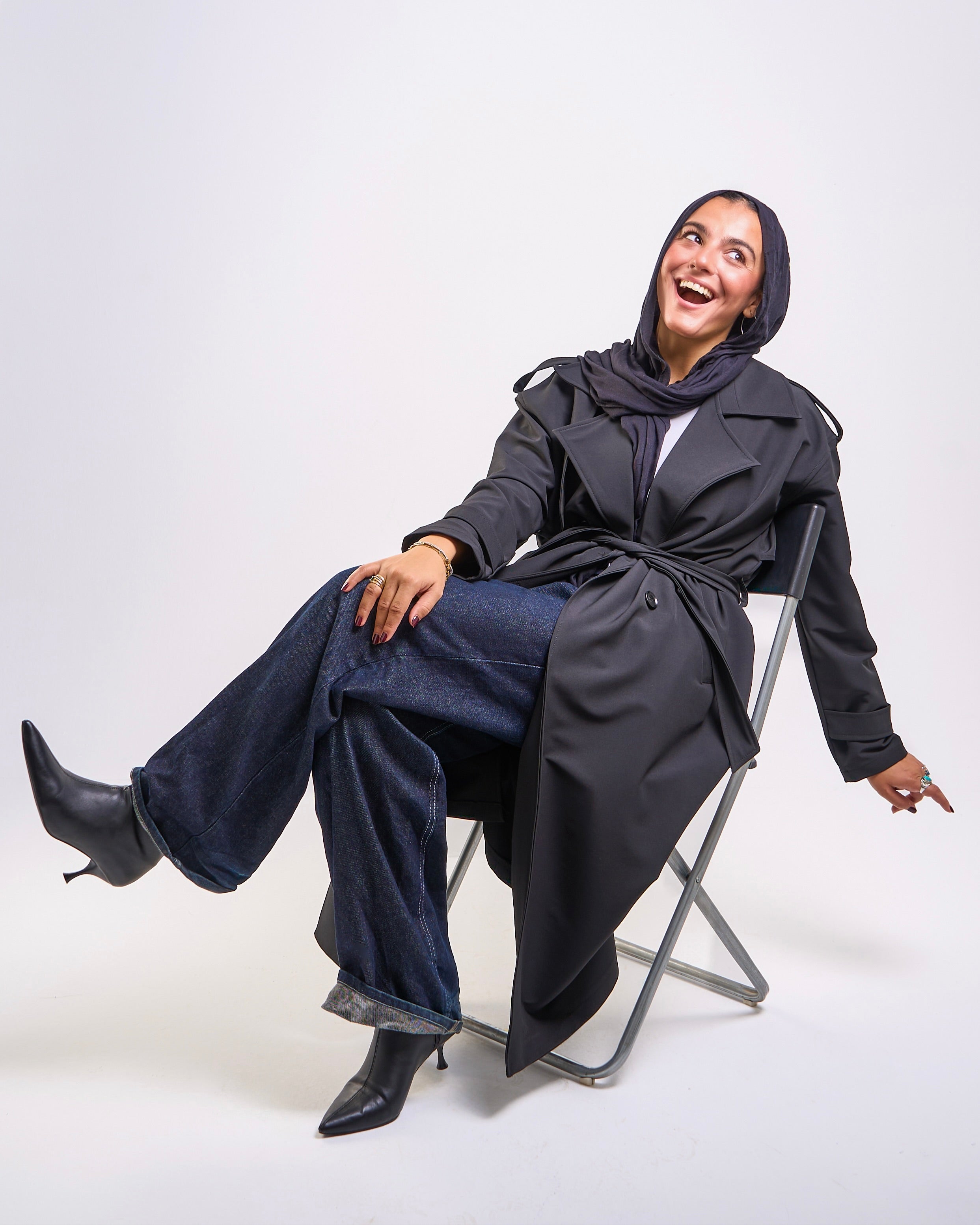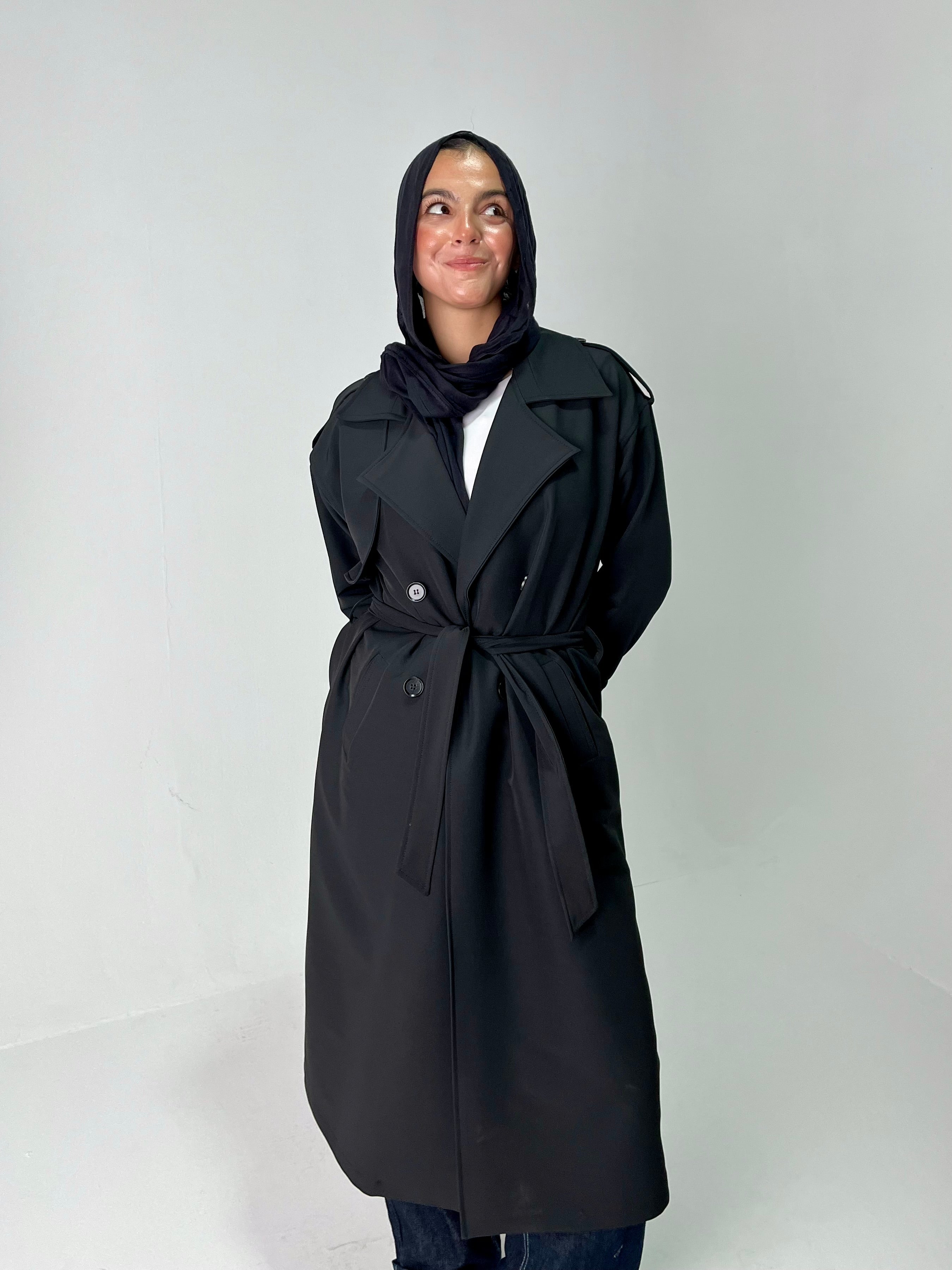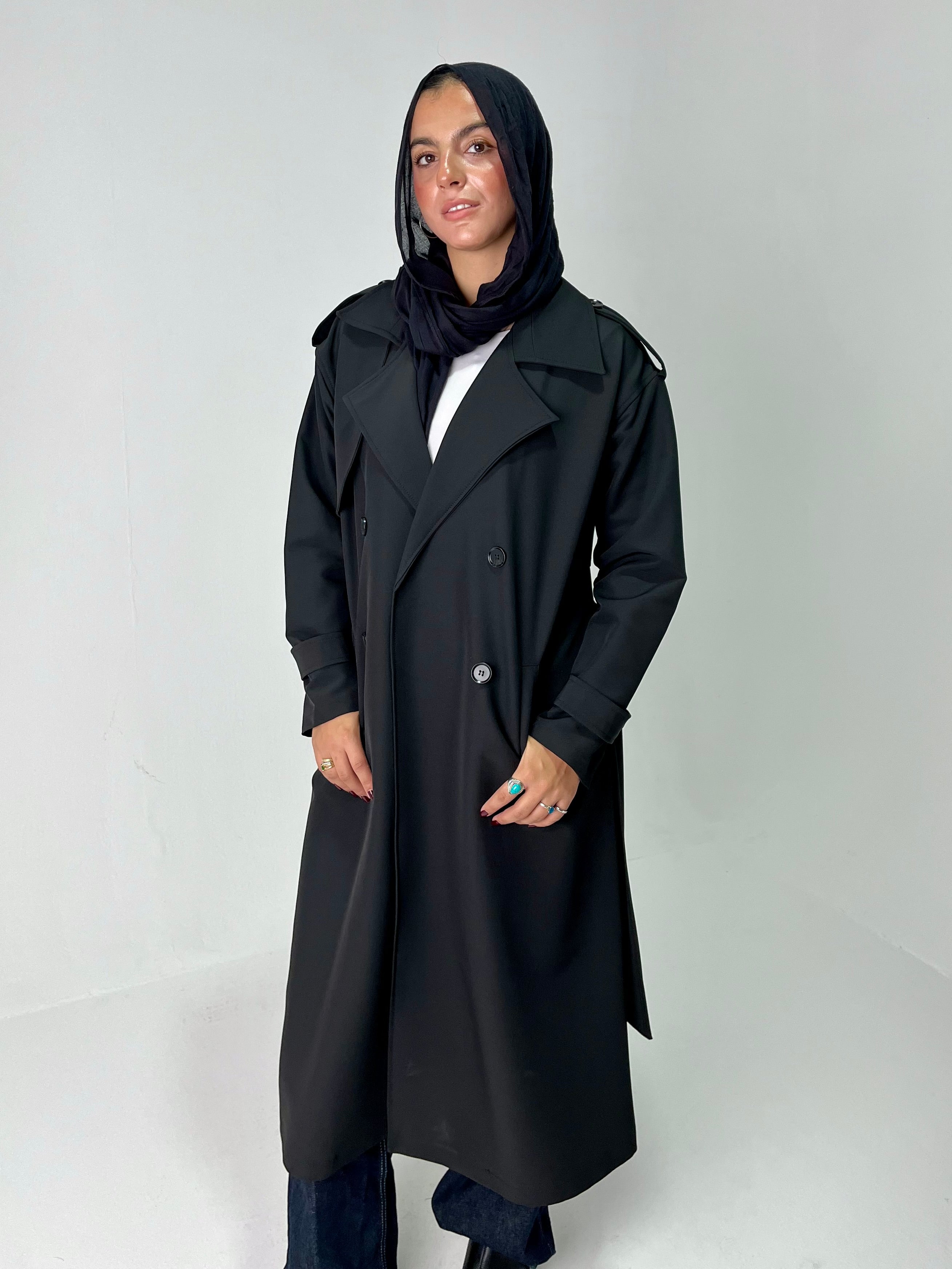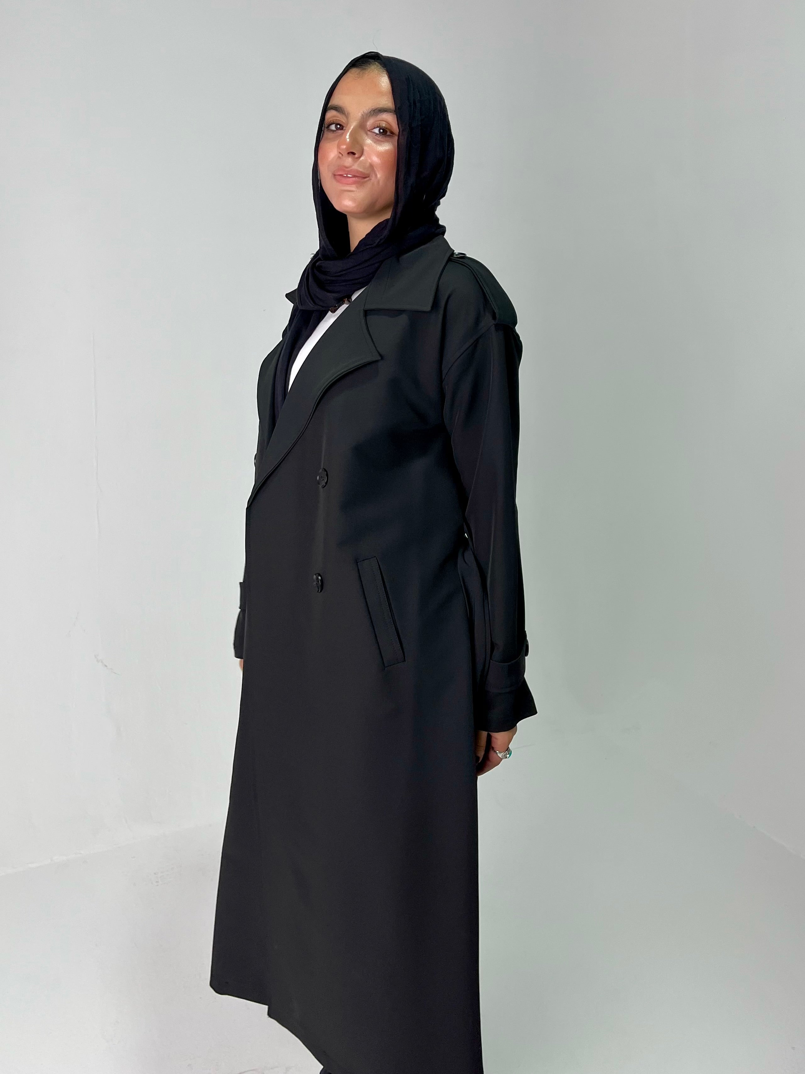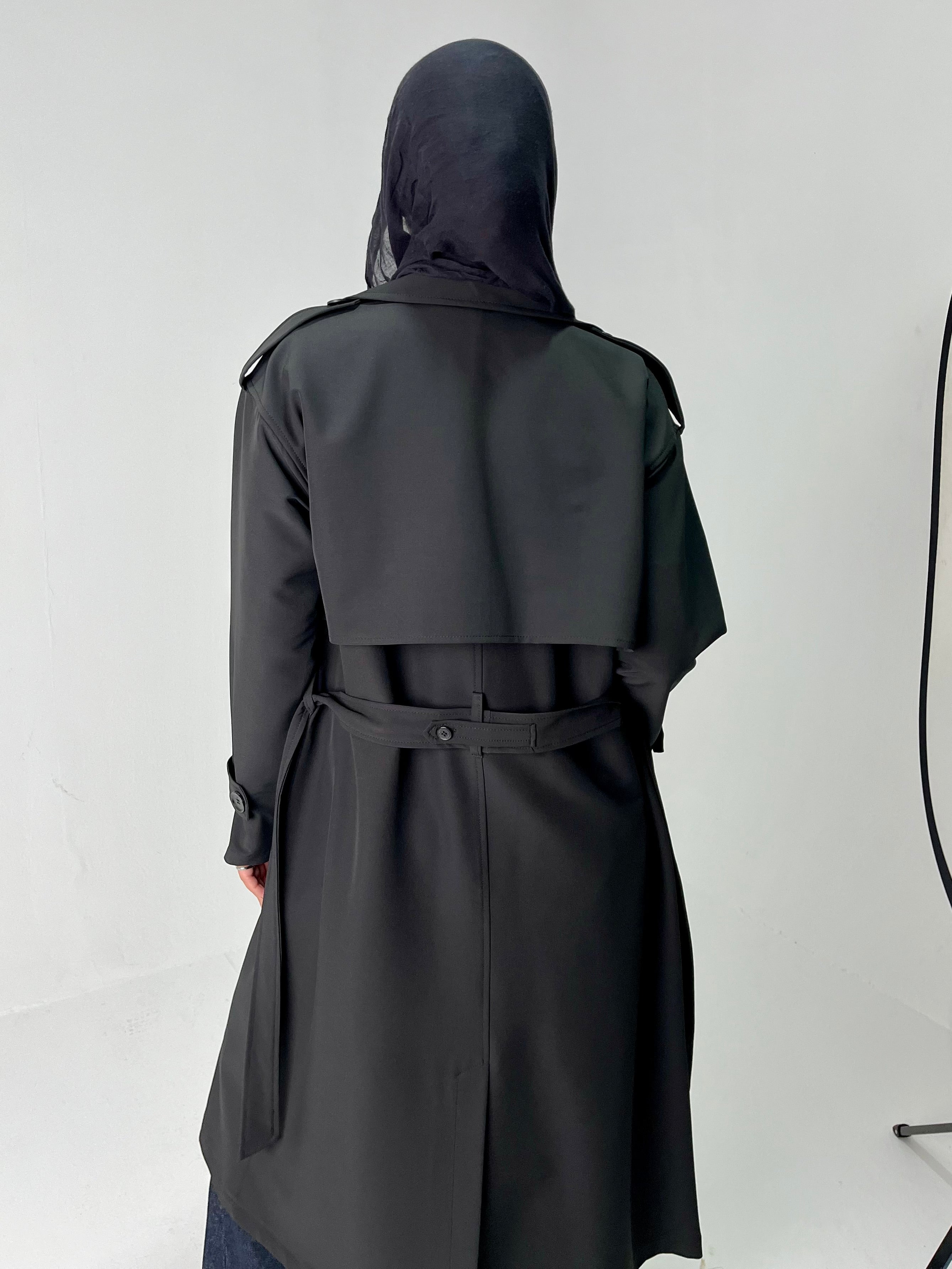Elevate your wardrobe with this timeless Classic black Trench Coat, a must-have piece for transitional seasons. Made from a smooth, durable fabric, it features double-breasted button detailing, a belted waist, and shoulder epaulettes for a refined, tailored appearance. Whether dressed up for work or styled casually for everyday wear, this coat offers effortless sophistication.
