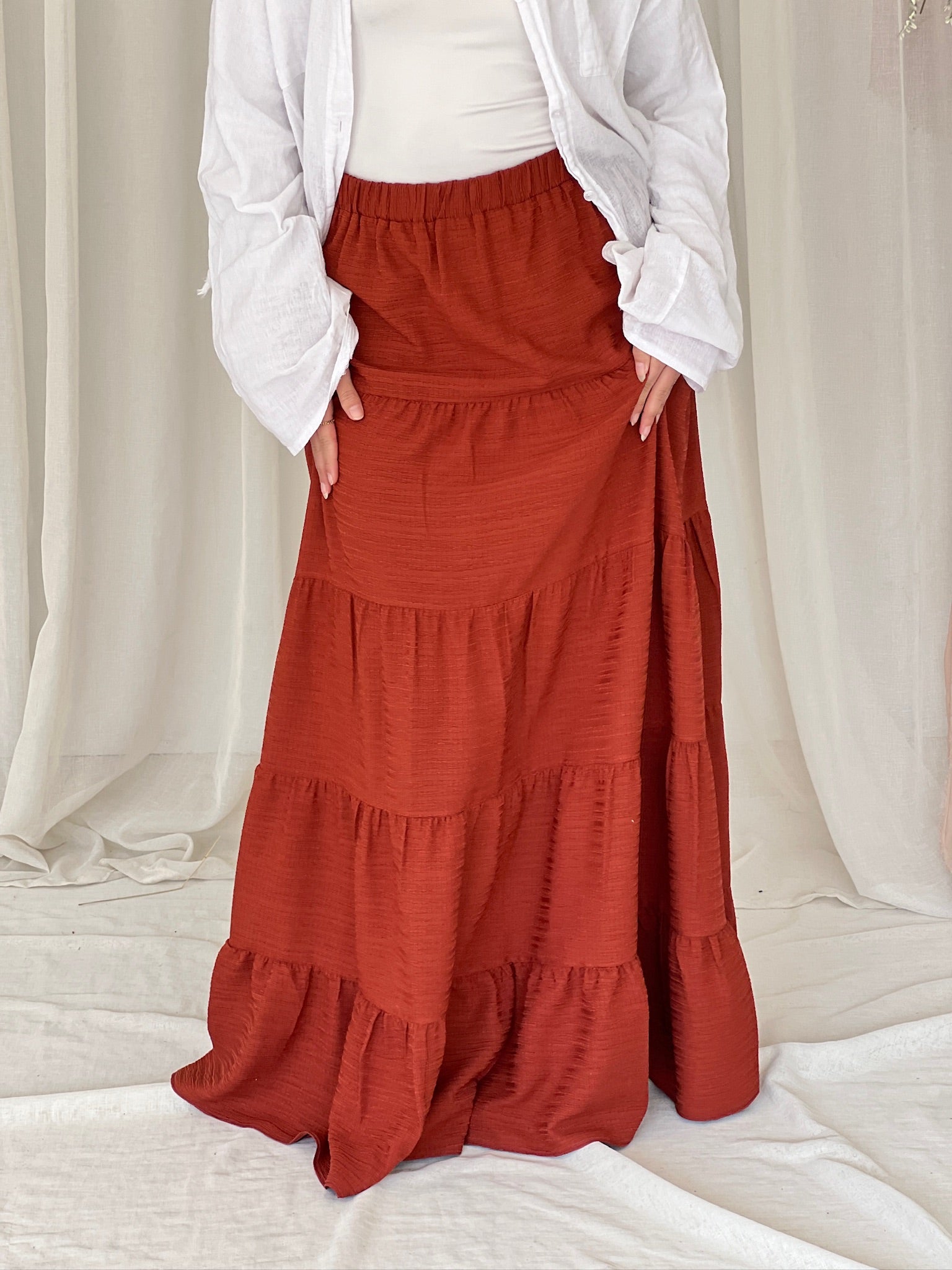 The Zahra skirt in copper is expertly crafted with a beautiful copper fabric that catches the light and adds a touch of elegance to any outfit. With its versatile design and flattering fit, this skirt is perfect for any occasion and will make you feel confident and stylish. Embrace the timeless luxury of this stunning skirt.